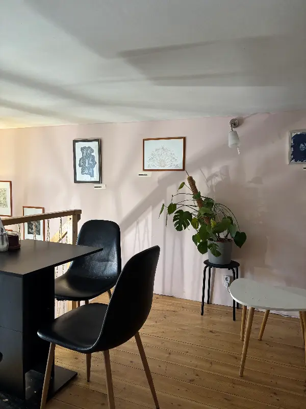 리뷰에서 언급된 것처럼, 카페는 정말 아늑하고 예뻤다. 식물들이 많아서인지, 차분하고 따뜻한 분위기가 느껴졌다. 작은 공간이었지만, 테이블 간 간격이 넓어 편안하게 시간을 보낼 수 있었다. 특히 2층으로 올라가는 계단 옆에 놓인 몬스테라 화분은 눈길을 사로잡았다.