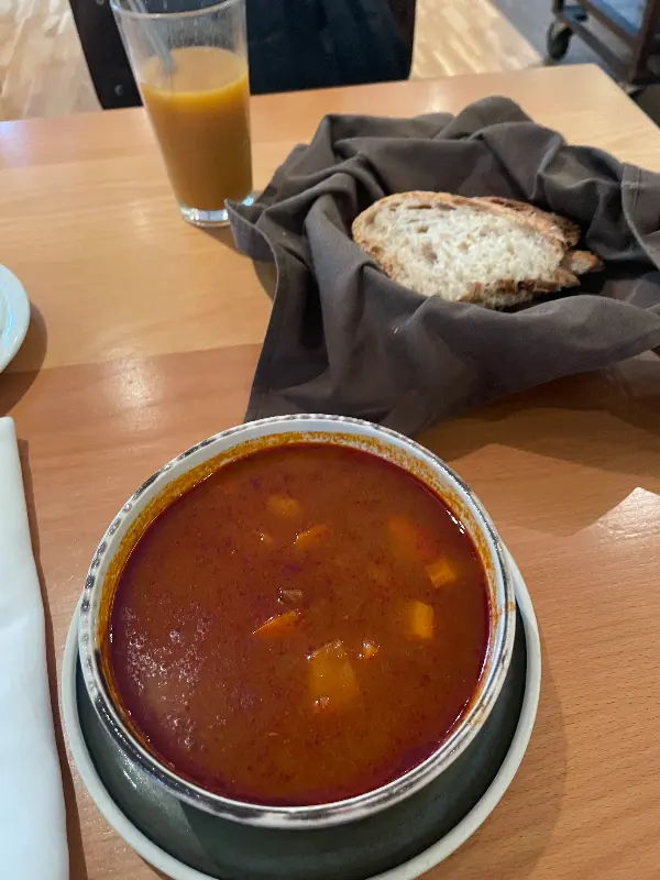 테이블 위에 놓인 따뜻한 굴라쉬 한 그릇과 신선한 빵, 그리고 햇살을 담은 듯한 오렌지 주스가 식사를 더욱 풍성하게 만들어준다.
