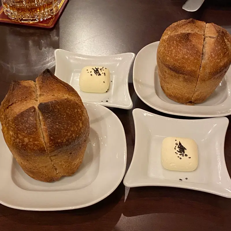 식사 전 제공되는 빵과 버터. 빵의 겉은 바삭하고 속은 촉촉하다.