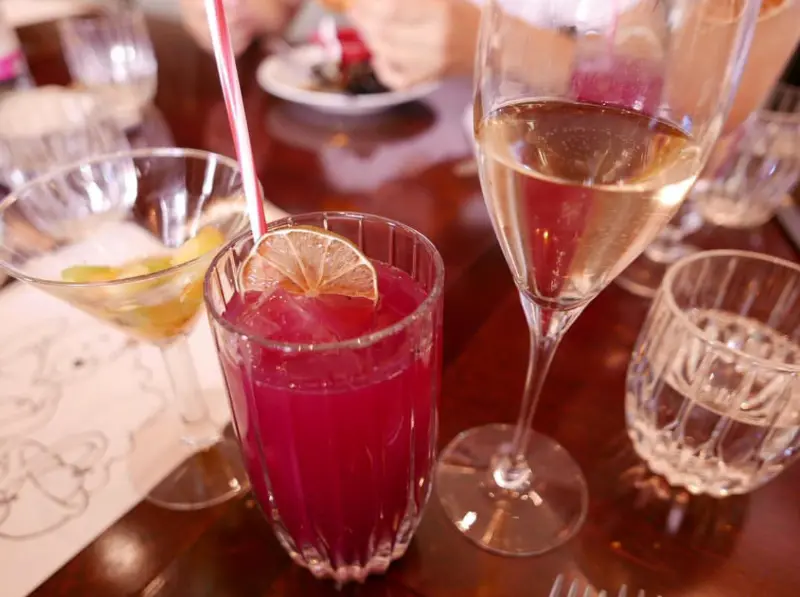 테이블 위에는 오렌지 쥬스 외에도 다양한 음료들이 놓여 있었다. 붉은 빛깔의 주스와 샴페인 잔은 화려한 분위기를 더했고, 섬세하게 장식된 레몬 슬라이스는 보는 즐거움까지 선사했다.