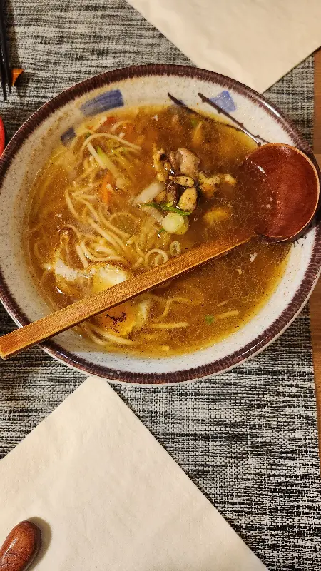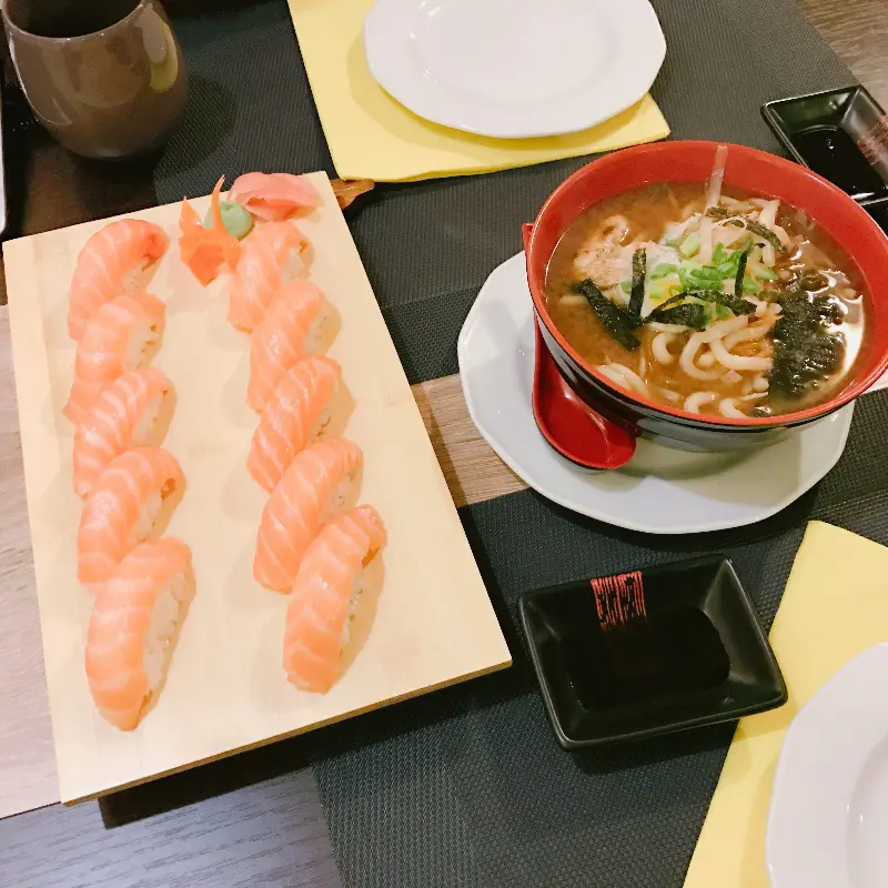 가장 먼저 연어 초밥을 맛보았다. 입 안에서 살살 녹는 부드러운 식감과 신선한 연어의 풍미가 환상적인 조화를 이루었다. 특히 이곳의 연어 초밥은 유럽에서 맛보는 것임에도 불구하고, 한국에서 먹던 맛과 견주어도 손색이 없을 정도였다. 닭고기 라멘은 맑은 국물에 닭고기와 우동 면이 어우러진 독특한 메뉴였다. 흔히 생각하는 일본 라멘과는 다른, 한국인의 입맛에 맞춘 듯한 퓨전 라멘이었다. 국물은 시원하고 깔끔했으며, 닭고기는 부드럽고 담백했다. 면발은 쫄깃했고, 전체적으로 조화로운 맛이었다.