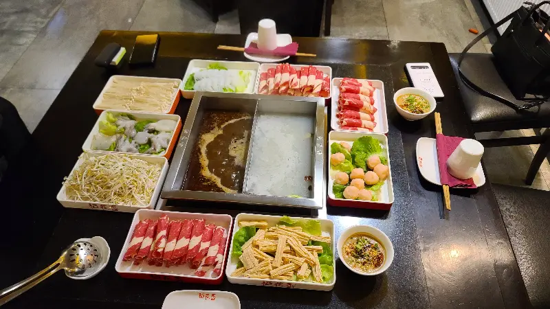 테이블 위에는 신선한 채소, 얇게 썰린 고기, 탱글탱글한 해산물 등 훠궈에 넣어 먹을 다양한 재료들이 보기 좋게 놓여 있습니다. 이 모든 재료들이 끓는 육수 속에서 어우러져 만들어내는 풍성한 맛은, 헝가리에서의 특별한 추억을 더욱 깊게 만들어 줄 것입니다. 마치 잘 꾸며진 팔레트처럼, 식탁 위에는 먹음직스러운 재료들이 가득 펼쳐져 있습니다.