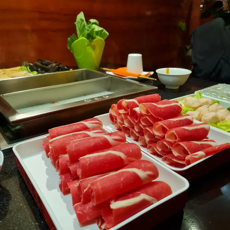테이블 위에 놓인 양고기는 선명한 붉은 빛깔을 띠고 있으며, 섬세한 마블링이 신선함을 더합니다. 얇게 썰린 양고기를 뜨거운 육수에 살짝 담갔다 건져 먹으면, 입안에서 사르르 녹는 듯한 부드러운 식감을 느낄 수 있습니다. 신선한 채소와 함께 곁들여 먹으면, 더욱 풍성하고 건강한 훠궈를 즐길 수 있습니다.