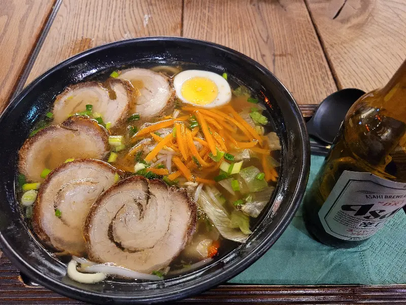 테이블 위에 놓인 라멘과 시원한 맥주 한 잔. 완벽한 조합이다.