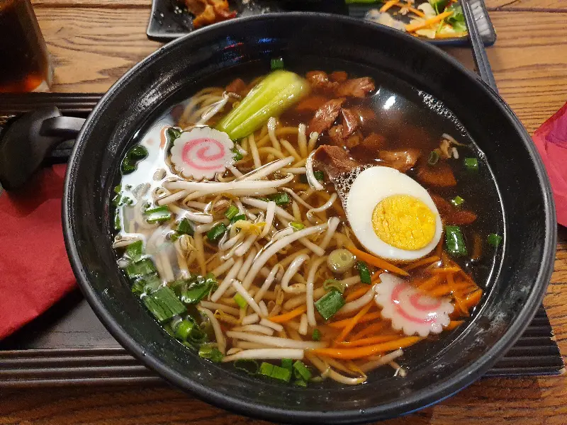 간장 돈코츠 라멘은 기존에 먹어왔던 일본 라멘과는 조금 다른 느낌이었습니다. 깊고 진한 돈코츠 육수를 기대했지만, 야채 육수에 소금으로 간을 한 듯한 맑은 국물이었습니다. 면 역시 칼국수 면처럼 굵고 덜 익은 듯한 느낌이었습니다. 하지만 라멘이라는 틀을 벗어나면, 운남 지방에서 맛봤던 쌀국수와 비슷한 독특한 매력을 느낄 수 있었습니다. 새로운 시도를 좋아하는 분이라면, 한번쯤 경험해볼 만한 맛입니다. 사진 속 라멘에는 분홍색 소용돌이 모양의 어묵과 반숙 계란이 얹어져 있어 먹음직스러움을 더합니다.
