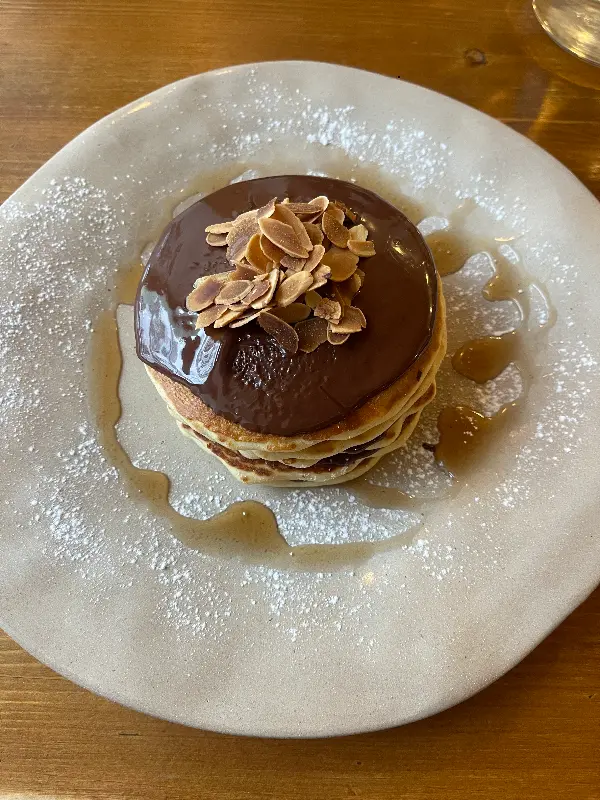 칠브르의 여운이 가시기도 전에, 달콤한 디저트의 유혹이 시작되었다. 친구가 주문한 팬케이크는 초콜릿 소스와 아몬드 슬라이스가 듬뿍 올려져 있었다.