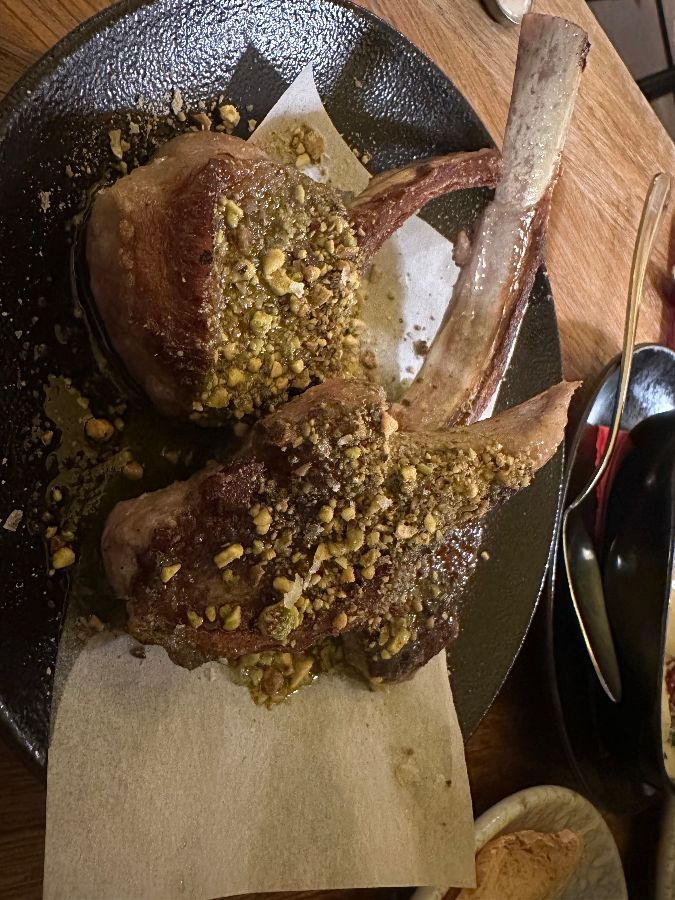 해산물뿐만 아니라 육류 요리 또한 TAPASIO의 자랑입니다. 특히, 피스타치오 크러스트를 입힌 양갈비는 비주얼만으로도 침샘을 자극합니다. 노릇하게 구워진 양갈비 위에 고소한 피스타치오가 아낌없이 뿌려져 있어, 부드러운 육질과 바삭한 크러스트의 조화로운 식감을 맛볼 수 있습니다. 뼈대까지 깔끔하게 손질되어 나와 먹기에도 편리하며, 풍부한 육즙과 향긋한 피스타치오 향이 어우러져 깊은 만족감을 선사합니다.