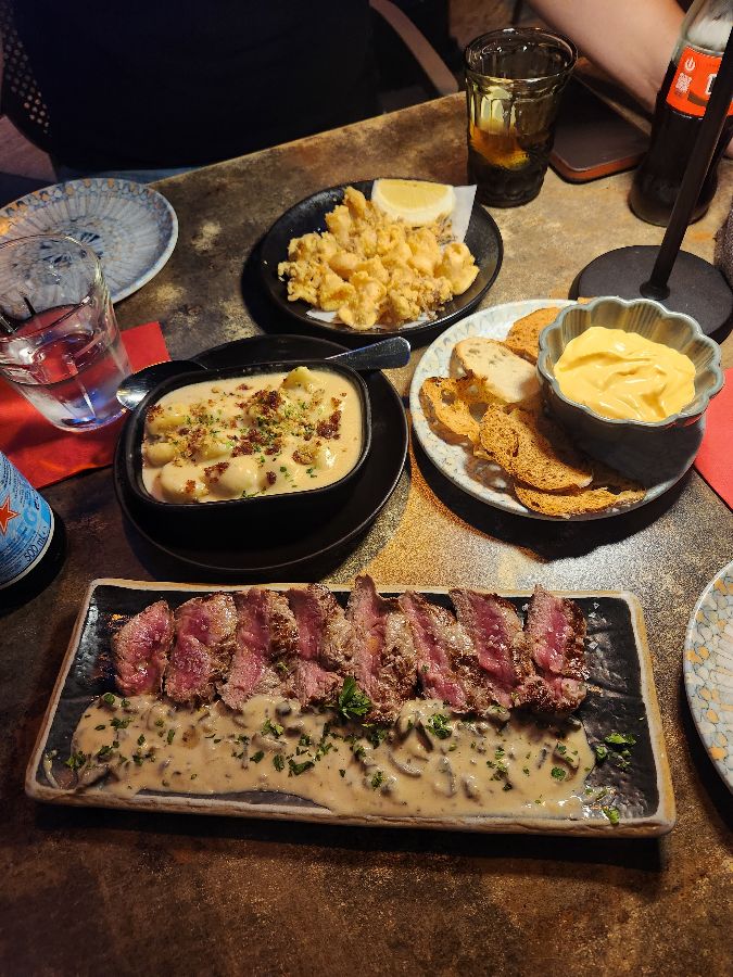 여기에 부드러운 감자와 진한 치즈 소스가 어우러진 요리는 따뜻하고 포근한 맛으로 입안을 감쌉니다. 크리미한 소스가 감자의 담백함을 더욱 돋보이게 하며, 든든한 만족감을 선사합니다. 함께 제공되는 바삭한 빵과 상큼한 소스, 그리고 고소한 디핑 소스는 각 요리의 맛을 한층 더 풍부하게 해줍니다. 특히, 디핑 소스는 짭짤한 빵과 환상의 궁합을 자랑하며 자꾸만 손이 가게 만듭니다.