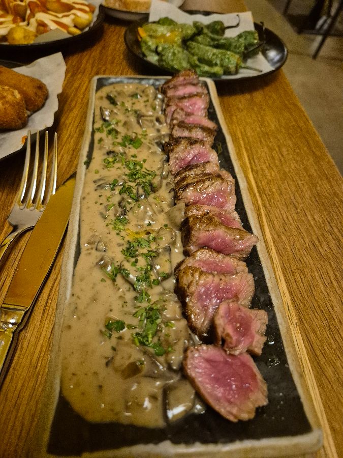 얇게 썰어낸 소고기 위에 부드러운 소스와 신선한 루꼴라, 그리고 견과류를 곁들인 요리 또한 인상적입니다. 붉은 빛깔의 소고기는 최상의 신선도를 자랑하며, 입안에서 살살 녹는 부드러운 식감이 일품입니다. 크리미한 소스와 향긋한 루꼴라, 오독오독 씹히는 견과류의 조화는 다채로운 맛과 식감의 향연을 선사합니다. 이 요리는 스페인 타파스 특유의 섬세함과 풍부한 맛을 동시에 느낄 수 있게 해줍니다. 플레이팅 또한 예술적이라 눈으로 먼저 즐기고 맛으로 감탄하게 되는 메뉴입니다.