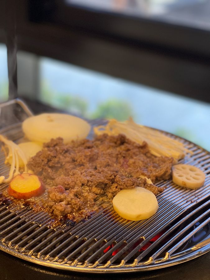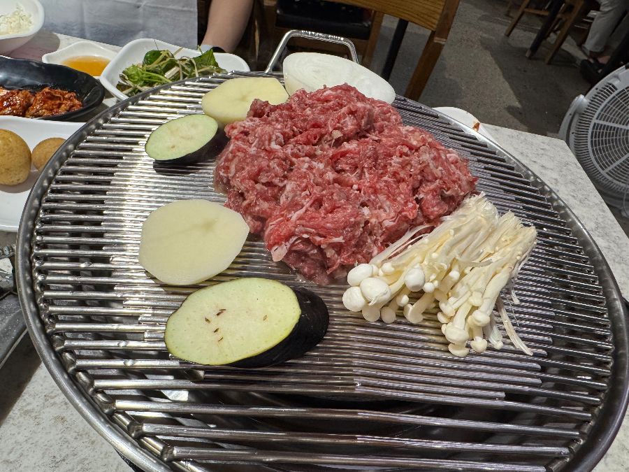 뜨겁게 달궈진 불판 위에 불고기를 올리자, “치익” 하는 소리와 함께 고소한 육향이 순식간에 테이블을 가득 채웁니다. 잘게 다져진 불고기는 다른 곳에서는 쉽게 볼 수 없는 독특한 비주얼을 자랑합니다. 함께 구워지는 양파와 버섯, 가지 등의 채소들이 불고기의 풍미를 더욱 돋보이게 합니다. 노릇하게 익어가는 불고기를 한 점 집어 입에 넣는 순간, 부드러운 식감과 함께 자극적이지 않으면서도 깊이 있는 육향이 입안 가득 퍼집니다. 단맛과 짠맛의 조화가 절묘하여 부담 없이 계속 손이 가는 맛입니다. 마치 집에서 정성껏 만든 불고기처럼 편안하고 익숙한 맛이지만, 그 깊이는 결코 평범하지 않습니다.