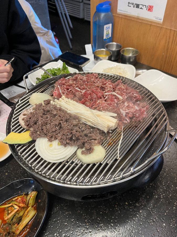 자리에 앉으면 곧이어 테이블 가득 차려지는 밑반찬들의 향연에 눈이 즐거워집니다. 신선한 쌈 채소와 아삭한 김치, 그리고 이름 모를 정갈한 반찬들이 식사의 시작을 알립니다. 이곳의 쌈 채소는 직접 농사지은 유기농 야채라 더욱 신선하다고 하니, 그 푸릇푸릇한 색감만 보아도 건강함이 느껴집니다. 잠시 후 숯불 화로가 놓이고, 오늘의 주인공인 언양불고기가 등장합니다. 1++ 등급의 한우 등심으로 만든 불고기는 마치 붉은 꽃이 피어난 듯 고운 자태를 뽐냅니다. 다진 고기가 동그랗게 뭉쳐져 은박지 위에 놓여 나오는데, 벌써부터 침샘을 자극하는 비주얼입니다.