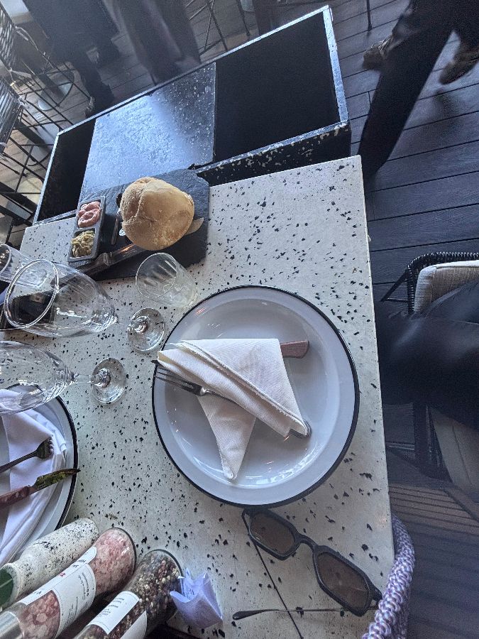 레스토랑 문을 열고 들어서자, 은은한 조명과 잔잔한 대화 소리가 저를 감쌌습니다. 세련되면서도 아늑한 분위기는 밖에서 느꼈던 기대감을 더욱 고조시켰죠. 친절한 직원의 안내를 받아 창가에 자리한 강이 보이는 좌석으로 향했습니다. 창밖으로는 부에노스아이레스의 현대적인 스카이라인과 잔잔하게 흐르는 강물이 그림처럼 펼쳐져 있었고, 이 풍경은 이내 저의 마음을 사로잡았습니다. 바쁜 일상 속에서 잠시 벗어나 온전히 이 순간에 몰입할 수 있도록 해주는 마법 같은 공간이었습니다. 테이블 위에는 이미 정갈한 식기 세트와 깨끗한 냅킨이 놓여 있었고, 은은한 빛을 머금은 와인잔들이 다음 여정을 기다리는 듯 영롱하게 빛났습니다.