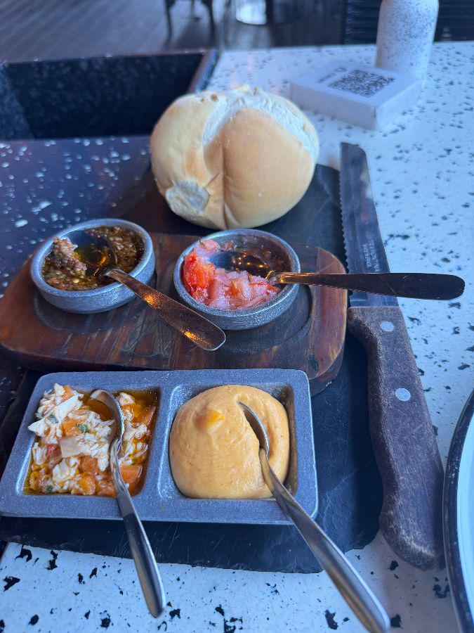 자리에 앉자마자, 테이블 위에 놓인 빵과 함께 다채로운 소스들이 서빙되었습니다. 이곳에서는 ‘cubierto’라는 명목으로 세팅비가 부과되는데, 이는 식전 빵과 여러 가지 특별한 소스를 제공하는 서비스의 일환이었습니다. 신선하게 구워진 빵과 함께 올리브 오일 기반의 차분한 맛부터, 살짝 매콤하면서도 감칠맛을 돋우는 소스까지, 혀끝을 자극하는 다채로운 향미가 미식 경험의 서막을 알렸습니다. 이 모든 과정을 세심하고 정중하게 응대해주었던 직원, 세르히오 로메로 씨의 서비스는 단연코 최고였습니다. 그의 친절함 덕분에 식사의 시작부터 마지막까지 유쾌함이 끊이지 않았죠. 메뉴를 고르는 동안에도 그의 전문적인 추천과 배려는 저에게 깊은 인상을 남겼습니다.