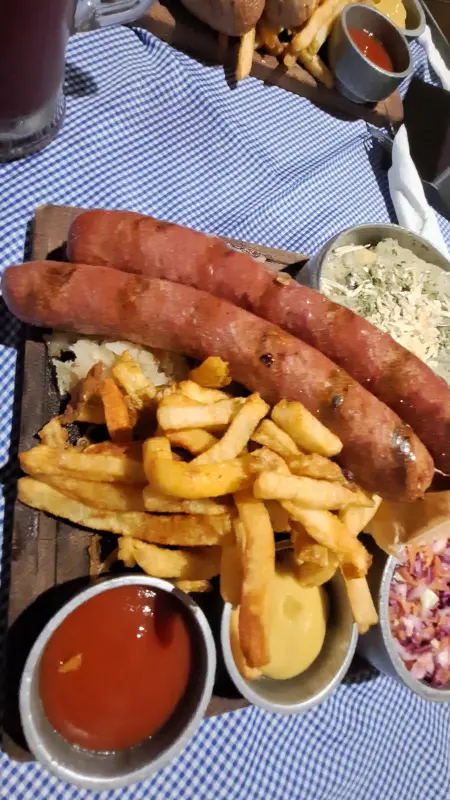 소시지와 함께 제공되는 감자튀김은 겉은 바삭하고 속은 포슬포슬하며, 케첩과 머스타드 소스에 찍어 먹으면 더욱 맛있습니다. 양배추 샐러드는 신선하고 아삭하며, 소시지의 느끼함을 잡아주는 역할을 합니다. 시원한 생맥주 한 잔을 곁들이면 그야말로 완벽한 식사가 완성됩니다. 나무 도마 위에 소시지, 감자튀김, 양배추 샐러드, 소스들이 보기 좋게 담겨 나오는 모습은 시각적인 즐거움까지 선사합니다. 청량한 푸른색 체크무늬 테이블보가 독일 바이에른 지방의 정취를 더하는 듯합니다.
