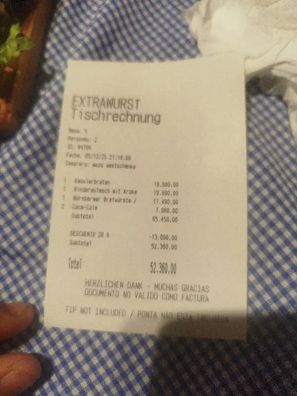 엑스트라부르스트 가스첸케는 합리적인 가격으로 훌륭한 음식을 제공합니다. 특히 현금으로 결제하면 할인 혜택까지 받을 수 있어 더욱 매력적입니다. 맛있는 음식을 저렴하게 즐길 수 있다는 점은 이곳을 방문해야 할 또 다른 이유입니다. 다만 신용카드 결제 시에는 수수료가 추가될 수 있으니, 현금 결제를 고려해보는 것이 좋습니다.