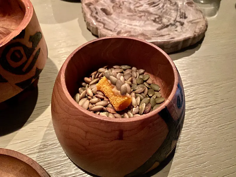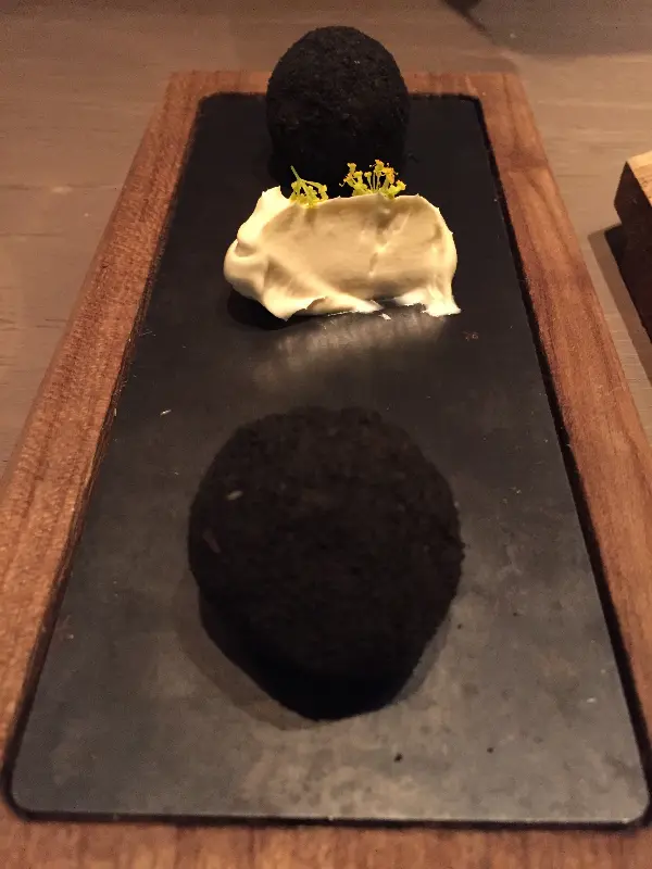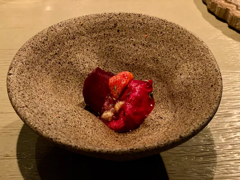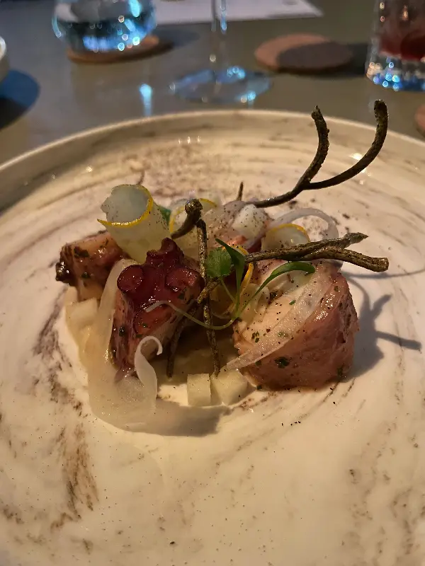 전체적으로 훌륭한 식사였지만, 솔직히 말하면 메인 요리는 다른 코스에 비해 다소 평범하게 느껴졌다. 조리 기술은 훌륭했지만, 문어와 흰살 생선은 약간 짰고, 곁들여 나온 일부 재료들은 기대에 미치지 못했다. 하지만 디저트가 모든 아쉬움을 씻어낼 만큼 환상적이었다. 마치 영화의 반전처럼, 마지막에 강렬한 인상을 남겼다.