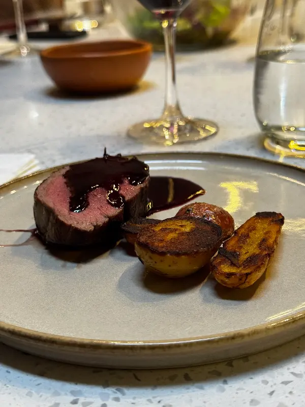 세련된 플레이팅이 돋보이는 아르헨티나 전통 음식. 검은색 사각 접시 위에 놓인 앙증맞은 크기의 음식들은 하나하나 정성이 가득 담겨 있습니다. 붉은색 음료는 식사의 시작을 알리는 상큼한 전주곡 같습니다.