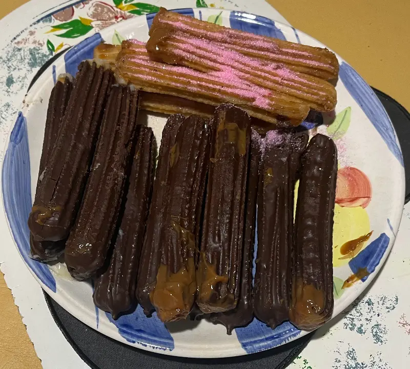 달콤한 둘세 데 레체가 듬뿍 들어간 츄러스의 모습입니다. 설탕이 뿌려진 겉면과 촉촉한 속살의 조화가 환상적입니다.