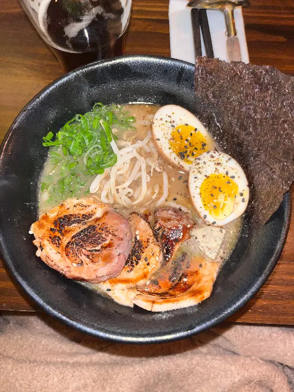 이미지 속 라멘은 윤기가 흐르는 차슈가 넉넉하게 올려져 있어 식욕을 자극합니다. 검은색 그릇에 담겨 더욱 먹음직스러워 보이는 라멘은 진한 육수와 신선한 토핑이 어우러져 시각적인 즐거움까지 선사합니다.