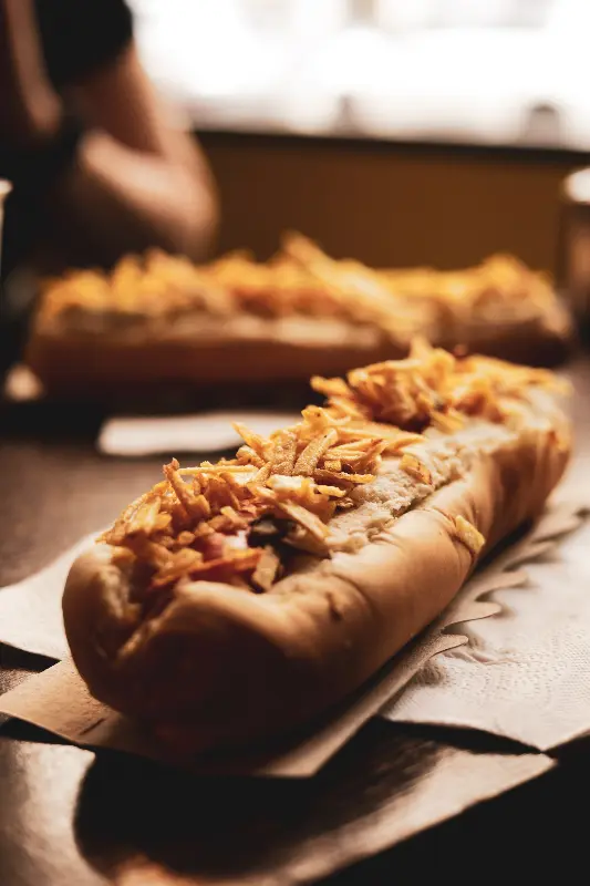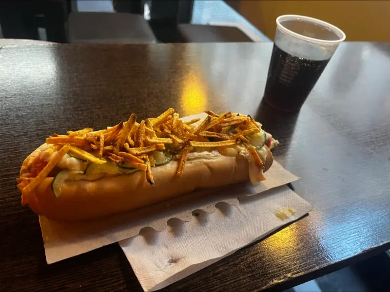 핫도그 위를 덮은 바삭한 슈스트링 감자튀김은 단순한 장식이 아닙니다. 짭짤하면서도 고소한 맛은 핫도그의 풍미를 한층 끌어올리며, 씹는 재미를 더합니다. 마치 어린 시절, 감자튀김을 핫도그에 얹어 먹던 추억을 떠올리게 하는 듯합니다.