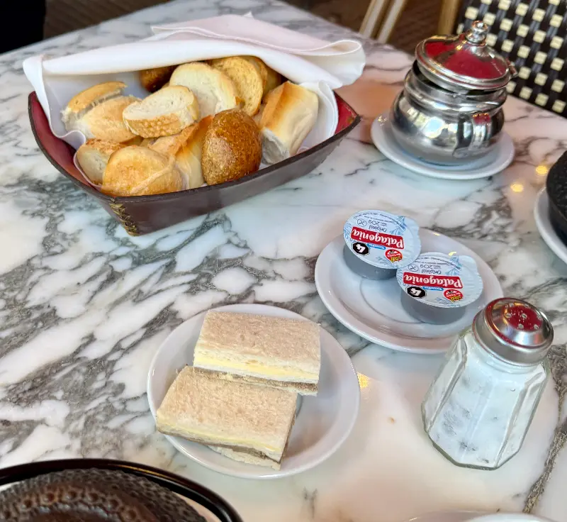 아르헨티나식 아침 식사로 추천받은 페이스트리와 우유 넣은 커피는 기대 이상이었다. 갓 구워져 따뜻한 페이스트리는 입안에서 부드럽게 녹아내리고, 은은한 단맛이 기분 좋게 퍼져나갔다. 커피는 부드러운 우유와 조화를 이루며, 페이스트리의 풍미를 더욱 깊게 만들어주었다. 탄산수를 곁들이니 입안이 깔끔하게 정리되는 느낌이었다.