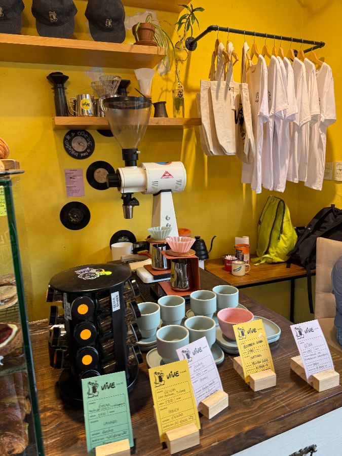 내부는 작고 소박하지만, 창밖으로 쏟아지는 아침 햇살이 벽면을 부드럽게 감싸 안으며 평화로운 활기를 더합니다. 딱딱하고 개성 없는 여느 카페들과는 달리, 이곳의 인테리어는 사장님의 손길이 닿은 듯한 독특한 스타일과 ‘소울’이 느껴지는 따뜻함으로 가득합니다. 벽에 걸린 아기자기한 소품들과 갓 볶은 듯한 원두가 담긴 자루, 그리고 감각적인 조명이 어우러져 비브 카페만의 고유한 매력을 발산합니다.