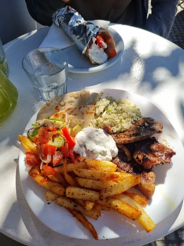 고민 끝에 그리스식 플래터를 주문했다. 플래터는 보기만 해도 푸짐했고, 다채로운 색감은 식욕을 자극했다. 윤기가 자르르 흐르는 고기, 신선한 채소, 그리고 독특한 향신료 냄새가 코를 간지럽혔다. 사진에서 보이는 것처럼, 플래터는 정말 둘이서 나눠 먹기에 충분한 양이었다.