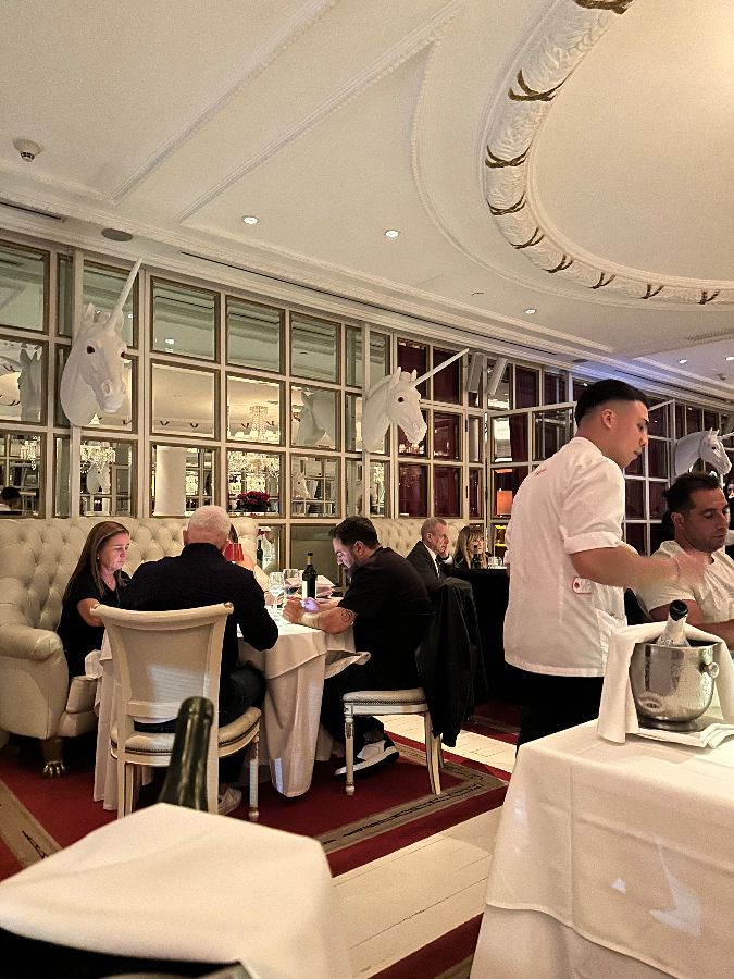 레스토랑에 들어서자마자 눈에 들어오는 것은 고급스러움과 세련됨이 조화롭게 어우러진 인테리어입니다. 은은하게 빛나는 조명 아래, 편안한 테이블과 의자가 놓여 있고, 벽면에는 독특한 예술 작품들이 걸려 있습니다. 특히 눈길을 사로잡는 것은 천장에 매달린 유니콘 조형물입니다. 이곳에서 식사하는 모든 순간이 마치 예술 작품의 일부가 된 듯한 느낌을 선사합니다.