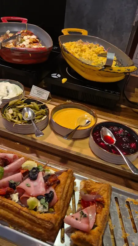 아침 식사 코너는 크루아상, 시리얼을 곁들인 요거트, 머핀, 견과류, 프렌치토스트 등으로 구성되어 있었지만, 다양성이 부족하다는 느낌을 받았습니다. 하지만 곧 이어진 디저트 코너에서 아쉬움을 잊을 수 있었습니다. 다양한 페이스트리, 뢰겔 케이크, 츄러스는 눈과 입을 즐겁게 하기에 충분했습니다.