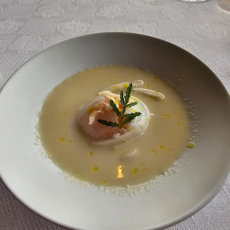 가장 먼저 나온 것은 정갈한 주전부리였습니다. 잣 향이 가득한 꾸덕한 주스는 팥과 생강의 조화가 인상적이었고, 쌀로 만든 전병은 바삭하면서도 입 안에서 부드럽게 부서지는 식감이 훌륭했습니다. 재료 본연의 깊은 맛이 살아있는 주전부리는, 앞으로 이어질 코스에 대한 기대감을 한껏 높였습니다. 특히 잣의 풍미가 진하게 느껴지는 꾸덕한 주스는 흔히 맛볼 수 없는 특별한 맛이었습니다. 은은하게 퍼지는 생강 향은 입 안을 개운하게 마무리해주는 역할을 했습니다.