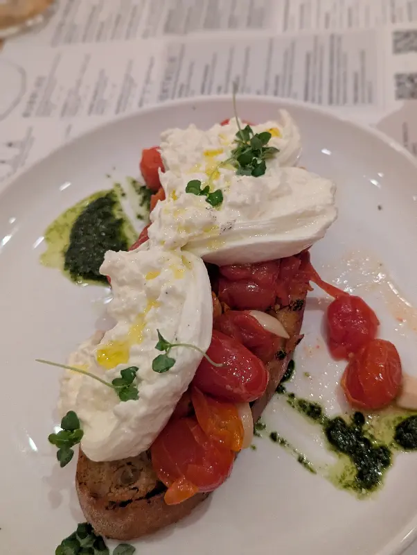 샐러드와 함께 애피타이저로 주문한 따뜻한 플랫브레드와 리코타 치즈는, 지역산 꿀과 함께 제공되었습니다. 부드러운 리코타 치즈와 달콤한 꿀의 조화는 환상적이었죠. 특히 허니콤은 씹을수록 입안 가득 퍼지는 달콤함이 잊을 수 없는 맛이었습니다. 프로슈토는 짭짤한 맛이 더해져 단짠의 조화를 이루었습니다.