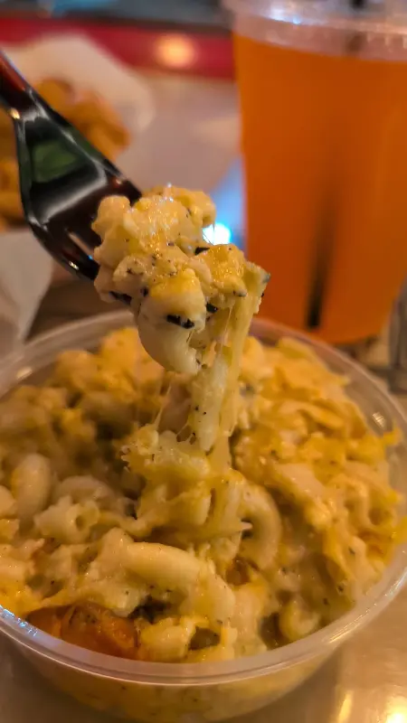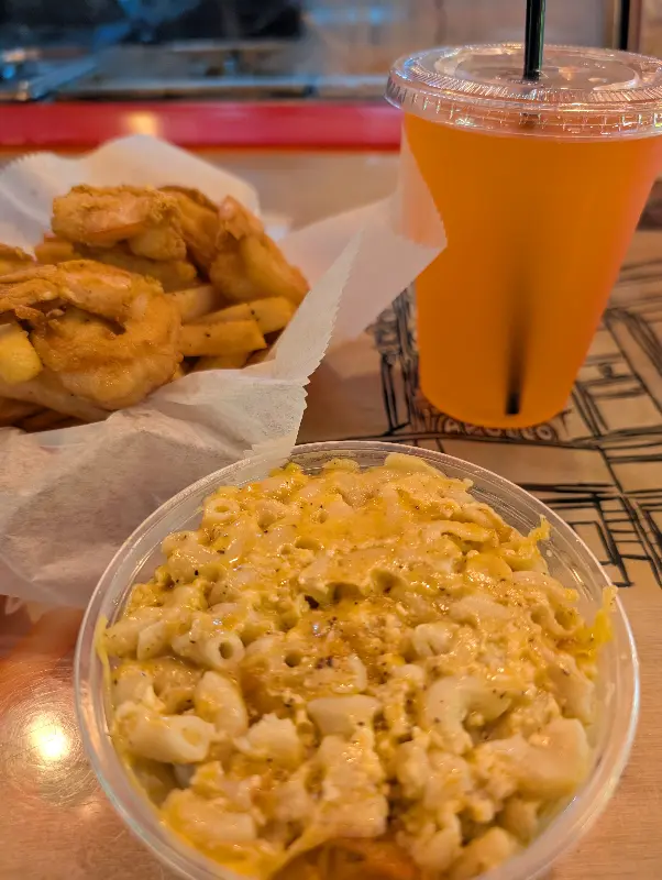 콤보 박스에 담긴 생선 필레와 새우, 그리고 타미 감자튀김은 정말 환상적인 조합이었습니다. 겉은 바삭하고 속은 촉촉한 생선 필레는 입안에서 살살 녹았고, 통통한 새우는 씹을수록 고소했습니다. 타미 셰프만의 특별한 레시피로 만들어진 감자튀김은 짭짤하면서도 달콤한 맛이 일품이었습니다. 특히, 맥앤치즈는 제가 먹어본 것 중 최고였습니다. 부드러운 치즈와 고소한 마카로니의 조화는 환상적이었고, 한 입 먹을 때마다 행복감이 밀려왔습니다.