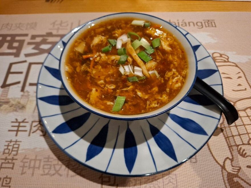 가장 먼저 눈길을 사로잡는 것은 진한 육수와 다양한 재료가 어우러진 뜨끈한 수프입니다. 붉은빛이 감도는 국물 위로 송송 썰린 파가 고명처럼 올라가 있고, 표고버섯, 당근, 그리고 부드러운 달걀이 조화롭게 어우러져 깊은 맛을 냅니다. 한 입 떠먹으면 몸속까지 따뜻해지는 감칠맛이 일품입니다.