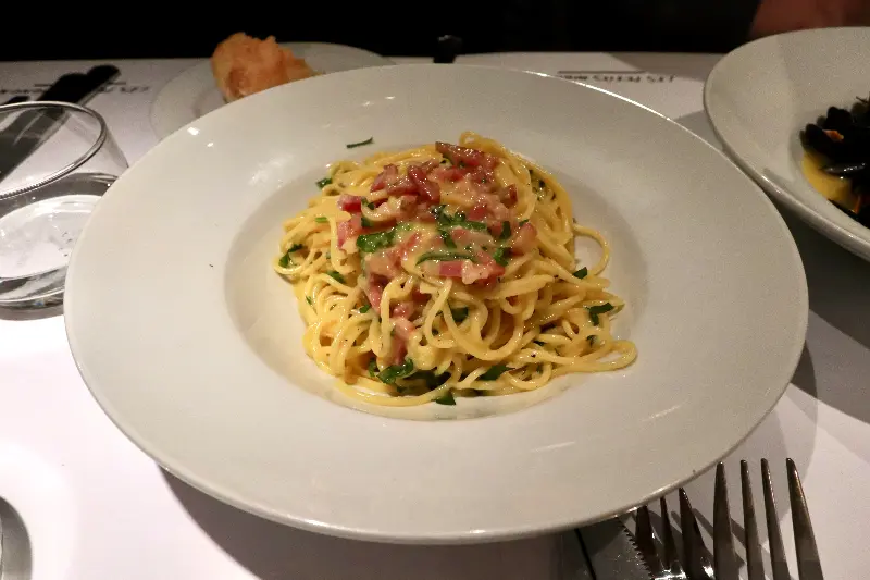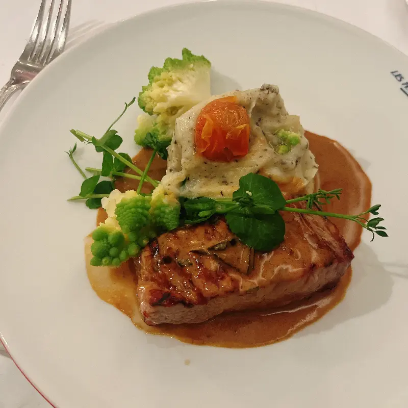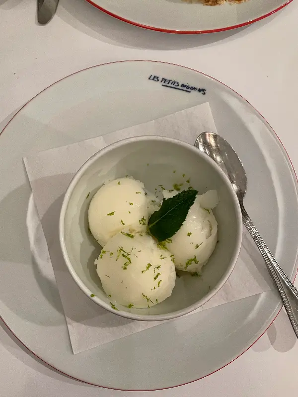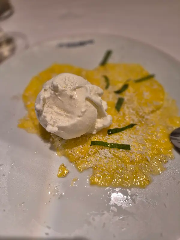 다른 날에는 코코넛 아이스크림을 곁들인 파인애플 카르파초를 먹었는데, 상큼한 파인애플과 시원한 아이스크림의 조합이 신선했다. 파인애플은 얇게 슬라이스 되어 있어 입안에서 사르르 녹았고, 코코넛 아이스크림은 달콤하면서도 고소했다.