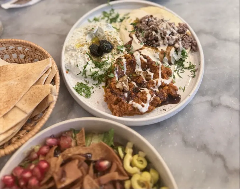 딥 소스 세 가지, 치킨 윙, 할루미, 파투쉬, 아라예스 토슈카 등 다양한 메뉴를 맛보았는데, 하나하나 신선한 재료 본연의 맛을 살리면서도 개성 강한 풍미를 자랑했습니다. 특히 딥 소스는 입맛을 돋우는 데 제격이었고, 치킨 윙은 겉은 바삭하고 속은 촉촉한 완벽한 조화를 이루었습니다. 할루미 치즈의 짭짤하면서도 고소한 맛, 파투쉬 샐러드의 상큼함, 아라예스 토슈카의 풍부한 육즙까지, 모든 메뉴가 잊을 수 없는 맛의 향연을 선사했습니다. 신선한 야채와 허브의 향이 입안 가득 퍼지면서 마치 지중해 연안에 와 있는 듯한 착각을 불러일으켰습니다.