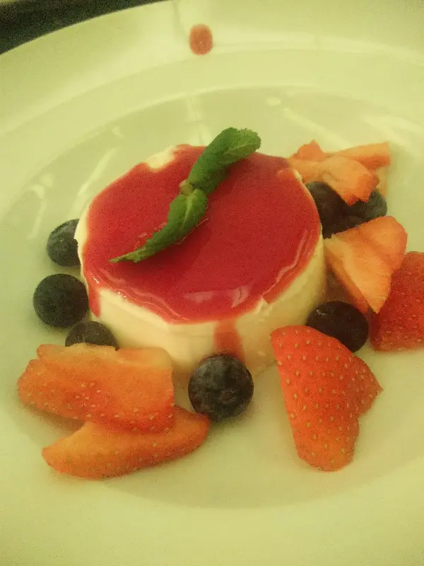 사진 속 판나코타는 그 자체로 예술 작품입니다. 하얀 도화지 위에 붉은 라즈베리 소스가 섬세하게 뿌려져 있고, 싱싱한 딸기와 블루베리가 흩뿌려져 있어 시각적인 즐거움을 더합니다. 한 입 맛보면 부드러운 질감과 달콤한 과일의 조화가 입안 가득 퍼지며, 잊을 수 없는 미식 경험을 선사합니다.