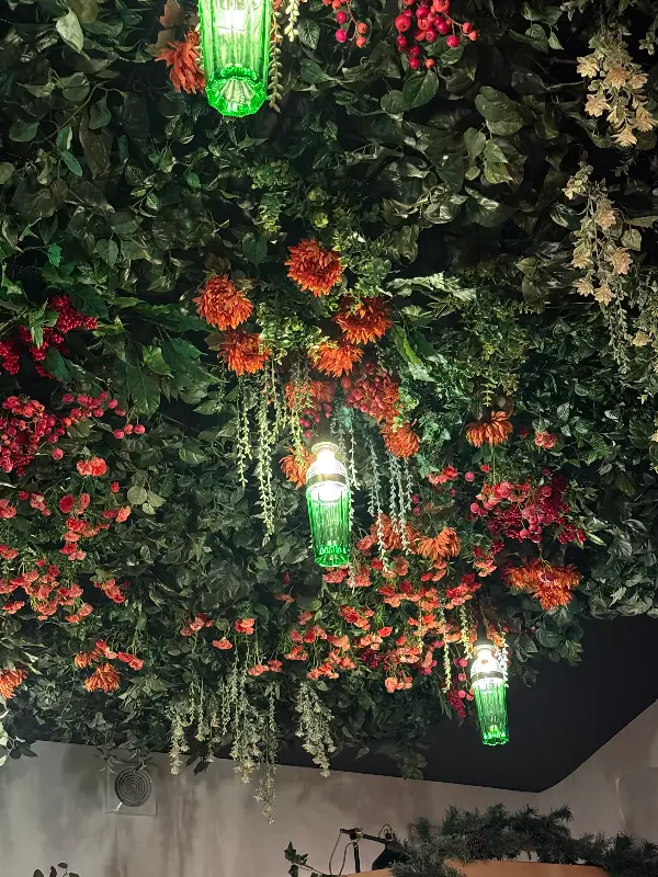 문을 열자마자 눈에 들어오는 것은 천장을 가득 덮은 초록빛 식물들과 화려한 꽃들의 향연이었다. Image 1과 Image 2에서 볼 수 있듯이, 천장에는 다양한 종류의 잎사귀와 붉은색, 흰색 꽃들이 조화롭게 어우러져 마치 비밀 정원에 들어온 듯한 착각을 불러일으킨다. 은은하게 빛나는 조명은 이 공간을 더욱 신비롭고 아늑하게 만들어준다. 좁은 통로를 따라 안으로 들어가니, 따뜻한 색감의 조명과 아늑한 분위기가 편안하게 나를 감싸 안았다. 벽면에는 앤티크한 액자들이 걸려 있고, 곳곳에 놓인 초록 식물들은 싱그러움을 더했다.