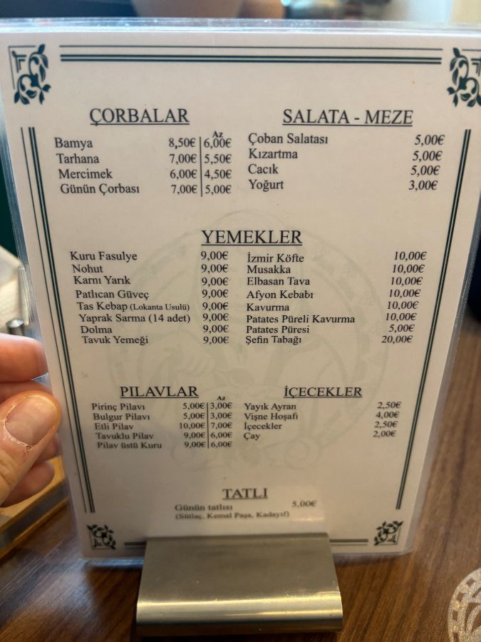자리에 앉자마자, 친절한 직원분이 메뉴판을 가져다주셨습니다. 메뉴판에는 다양한 터키 전통 요리들이 적혀 있었는데, 처음 보는 이름들이 많아 호기심을 자극했습니다. 메뉴를 고르기 어려워 망설이고 있자, 직원분은 각 요리에 대해 자세히 설명해주시며 추천 메뉴를 제안해주셨습니다. 마치 오랜 친구를 만난 듯 편안하고 따뜻한 서비스에 감동받았습니다. 메뉴판 디자인은 흰색 배경에 깔끔한 폰트로 작성되어 있으며, 테두리에는 섬세한 문양이 새겨져 있어 터키의 전통적인 아름다움을 느낄 수 있습니다. (Image 5 참고)