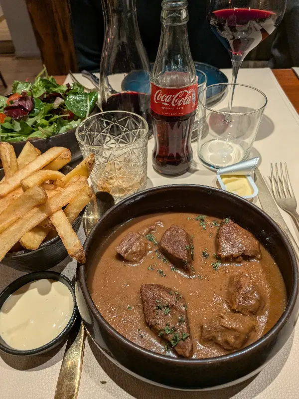 고민 끝에, Le Pré aux Clercs의 대표 메뉴인 카르보나드 플라망드(Carbonades Flamandes)와 신선한 생선 요리를 주문했다. 카르보나드 플라망드는 맥주를 곁들여 오랜 시간 끓인 소고기 스튜로, 브뤼셀의 전통적인 음식이다. 잠시 후, 테이블 위에 올려진 카르보나드 플라망드는 깊고 진한 갈색 빛깔을 뽐내고 있었다. 향긋한 허브 향과 맥주의 풍미가 코를 자극했고, 뜨거운 김이 식욕을 돋우었다.