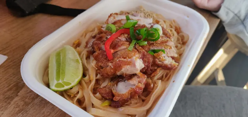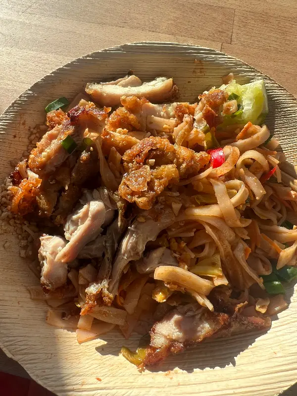 드디어 주문한 바삭한 치킨 팟타이가 나왔다. 접시 가득 담긴 팟타이 위에 바삭하게 튀겨진 치킨이 듬뿍 올려져 있었다. 고소한 냄새가 코를 자극했고, 먹음직스러운 비주얼은 식욕을 더욱 돋우었다.