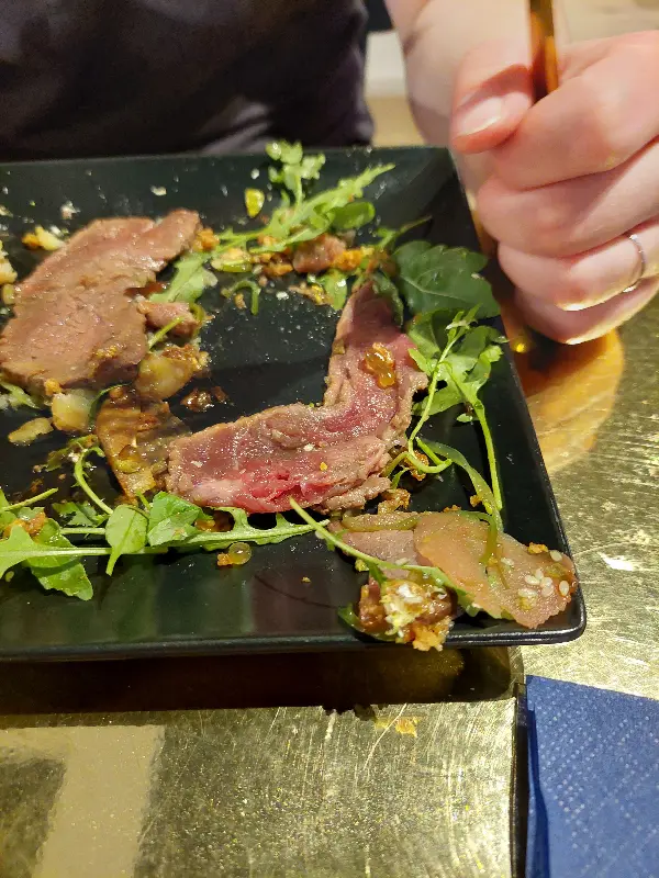 비트를 기반으로 한 팔라펠은 겉은 바삭하고 속은 촉촉했으며, 은은한 단맛이 입안 가득 퍼져나갔다. 후무스와 가지 딥소스는 신선한 야채와 함께 먹으니 더욱 풍성한 맛을 느낄 수 있었다. 아쉬웠던 점은 양고기의 맛이 너무 강했다는 것이다. 하지만 다른 메뉴들의 훌륭한 맛 덕분에 크게 개의치 않았다.