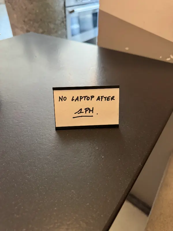 테이블 위에 놓인 노트북 사용 금지 안내문. 오후 1시 이후에는 노트북 사용이 제한된다.