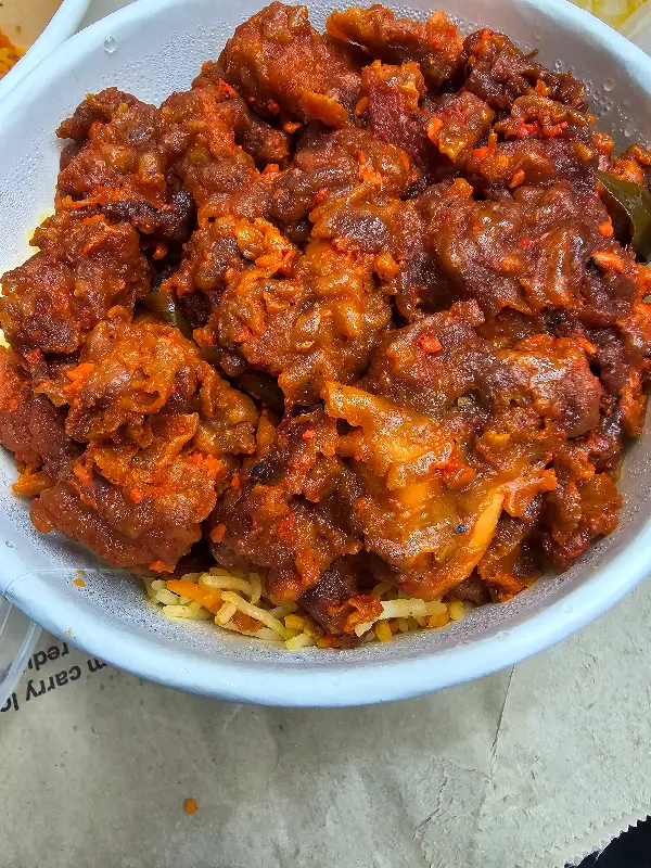 드디어 기다리고 기다리던 페퍼 치킨 비리야니가 눈 앞에 나타났다. 접시를 가득 채운 비리야니 위에는 윤기가 자르르 흐르는 치킨이 듬뿍 올려져 있었다. 붉은 빛깔을 뽐내는 치킨은 보기만 해도 군침이 돌았다. 밥알 사이사이에는 다양한 향신료가 섞여 있어, 시각적으로도 풍성함을 더했다. 한 입 맛보는 순간, 입 안 가득 퍼지는 향신료의 향연! 정통 인도 향신료의 풍미가 그대로 느껴졌다. 겉은 살짝 바삭하고 속은 촉촉한 치킨은, 비리야니와 환상적인 조화를 이루었다.