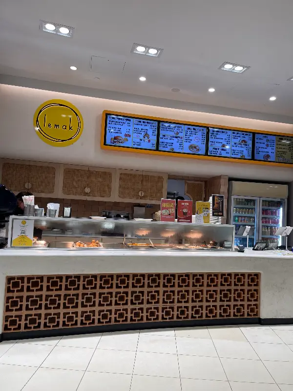 푸드코트 특유의 활기 넘치는 분위기 속에서 레막은 노란색 간판으로 시선을 사로잡았습니다. 사진에서 보이는 것처럼, 깔끔하게 정돈된 매장과 보기 좋게 진열된 음식들은 기대감을 더욱 높였죠. 메뉴판을 가득 채운 말레이시아 대표 음식들은 어떤 것을 골라야 할지 고민하게 만들었습니다.
