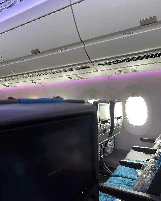 비행기 좌석에 앉아, 설레는 마음으로 이륙을 기다린다.