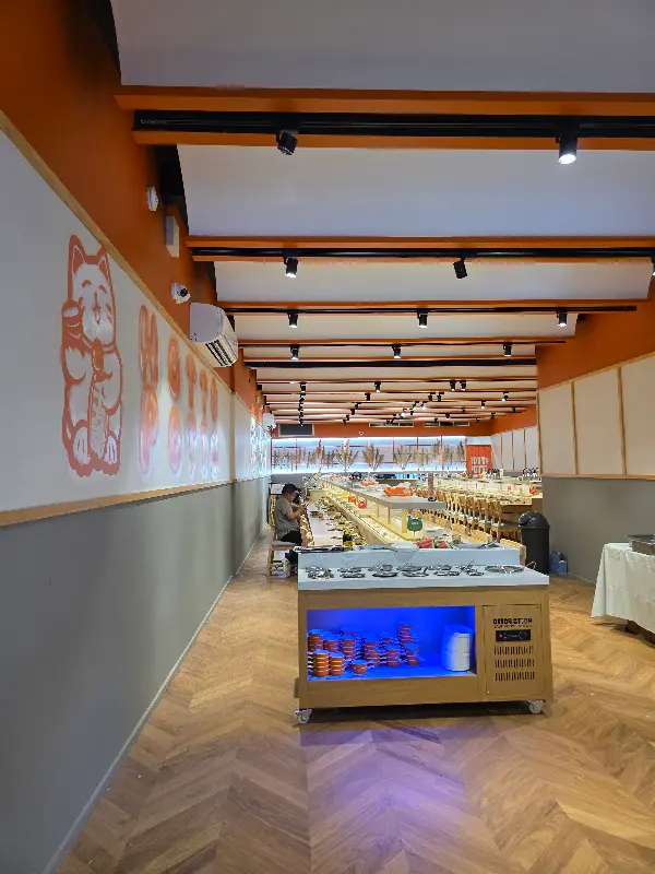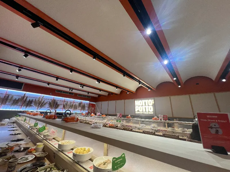 깔끔하고 넓은 Hotto Potto 내부. 다양한 식재료들이 놓여있는 회전 레일이 시선을 사로잡는다.
