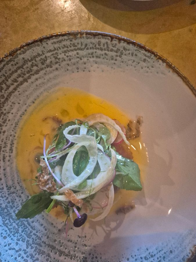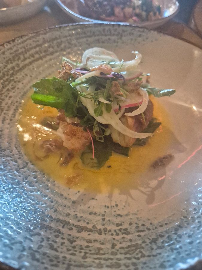 메인 요리만큼이나 사이드 메뉴 역시 Lulu의 미식 경험을 완성하는 중요한 요소입니다. 노란 소스 위로 아삭한 채소와 바삭하게 튀겨진 마늘 후레이크가 듬뿍 얹어진 사이드 메뉴는, 신선함과 고소함, 그리고 다채로운 식감을 동시에 선사합니다.