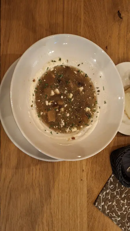 사진 속 수프는 뽀얀 크림이 묽게 풀어져 있고, 건더기로는 버섯과 허브가 흩뿌려져 있습니다. 따뜻한 김이 모락모락 피어오르는 모습은 식욕을 자극하지만, 맛은 기대에 미치지 못했습니다.