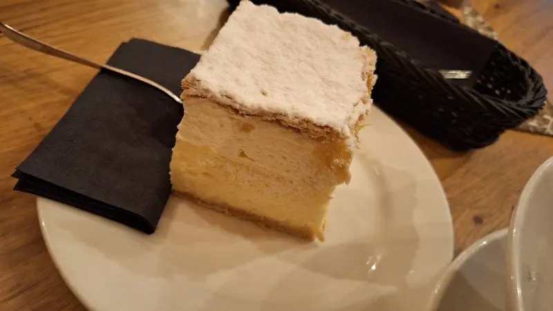 사진 속 크렘슈니타는 네모난 모양으로, 윗부분에는 슈가파우더가 듬뿍 뿌려져 있습니다. 겹겹이 쌓인 페이스트리와 커스터드 크림은 보기만 해도 달콤함을 느끼게 합니다. 한 입 베어 물면 입안 가득 퍼지는 달콤함과 부드러움은, 왜 크렘슈니타가 블레드의 명물인지 알 수 있게 해줍니다.