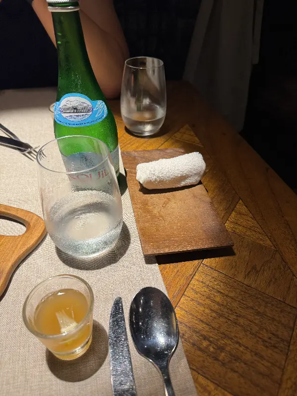 주문을 마치자, 식전빵이 나왔다. 버터 대신 제공된 호박잼은 예상 밖의 조합이었지만, 달콤하면서도 부드러운 맛이 빵과 환상적인 조화를 이루었다. 마치 걸쭉한 호박죽을 먹는 듯한 느낌이었는데, 따뜻하고 포근한 맛이 입맛을 돋우어 주었다. 나무 트레이 위에 놓인 따뜻한 물수건과 시원한 물 한 잔은 레스토랑의 세심한 배려를 느끼게 했다. 테이블 위에 놓인 작은 꽃 한 송이마저도 식사의 즐거움을 더해주는 듯했다.